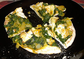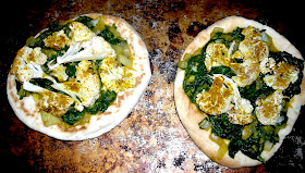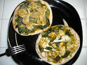 Spread spicy spinach sauce and roasted cauliflower onto flattened naan bread and bake in oven at 400 degrees fahrenheit for 10 minutes--this is just to make naan crispy since it has already been baked. If naan has not been baked and is still in dough form, add the above toppings along with raw, but seasoned cauliflower and bake at 400 degrees Fahrenheit for 20 minutes.