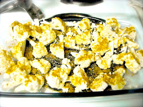Preheat oven to 400 degrees Fahrenheit. Chop head of cauliflower into bite-size pieces and spread into a glass baking dish. Sprinkle with spices and bake for 25-30 minutes. Cauliflower is done when it becomes a golden brown or when fork tender.