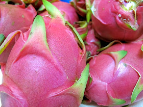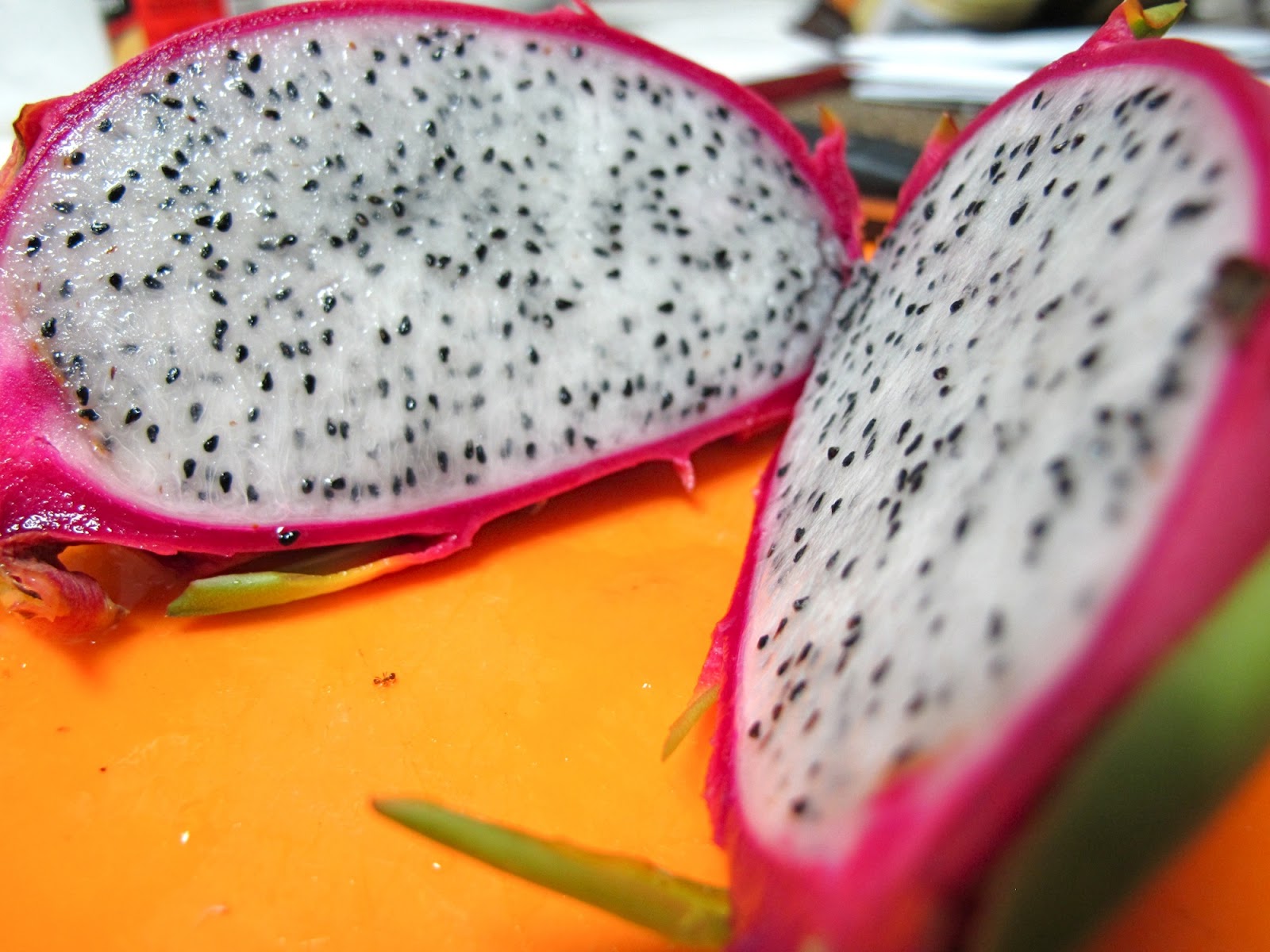 Slice dragon fruit long ways and scoop out white fruit with a spoon. The tiny black seeds give the fruit a consistency similar to kiwi, but with a more earthy taste.