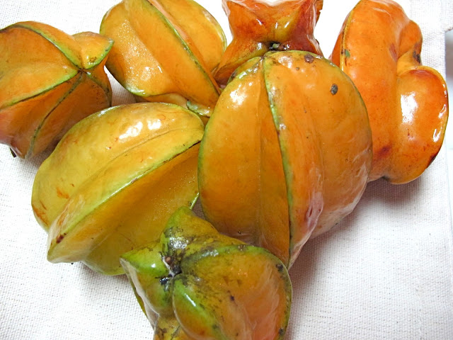 Slice "star fruit" short ways so that each thin slice looks like a star. The entire fruit is edible.