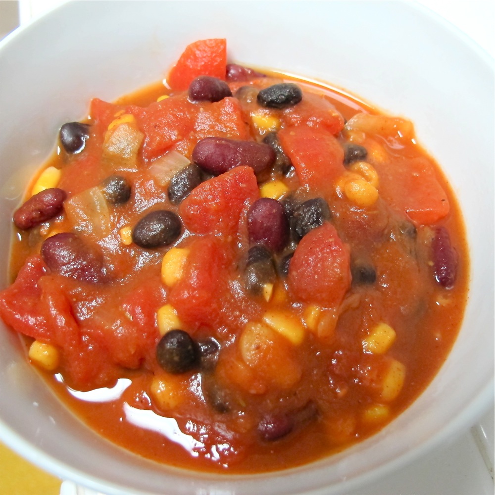 Sauté diced onions and garlic in a small amount of vegetable stock until translucent. Add the rest of the vegetable stock, pumpkin puree, and tomatoes with liquid. If you are using whole peeled tomatoes, make sure to crush a few of them into smaller chunks. Stir until incorporated. Next add beans that have been drained and rinsed, along with drained corn, and spices. Bring to a boil and then turn to a simmer. Cover and simmer for 45 minutes - 1 hour.