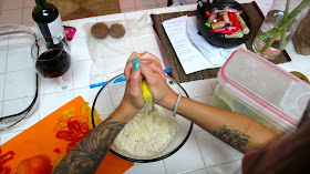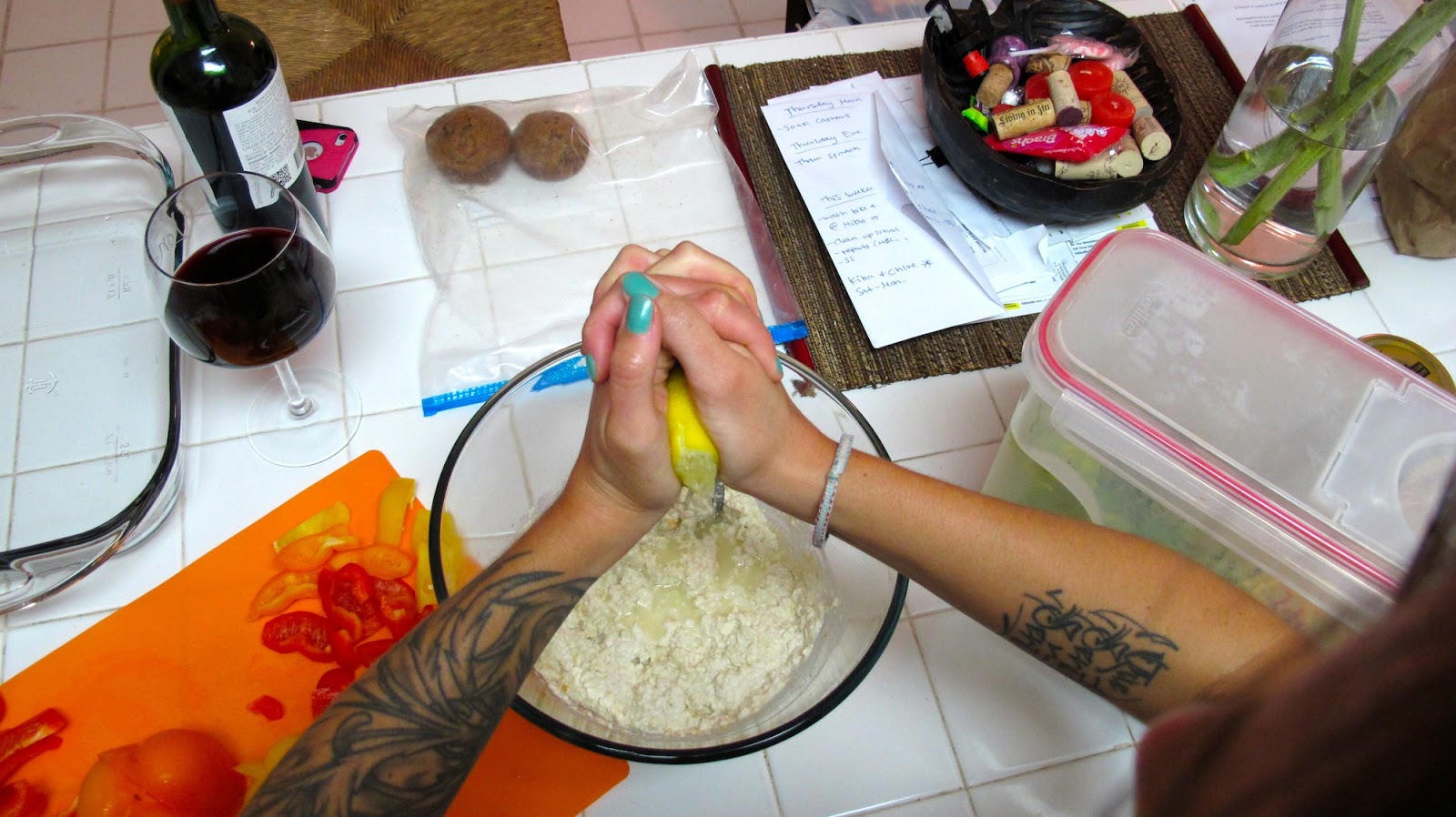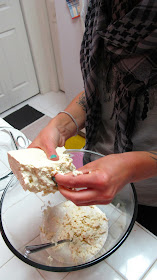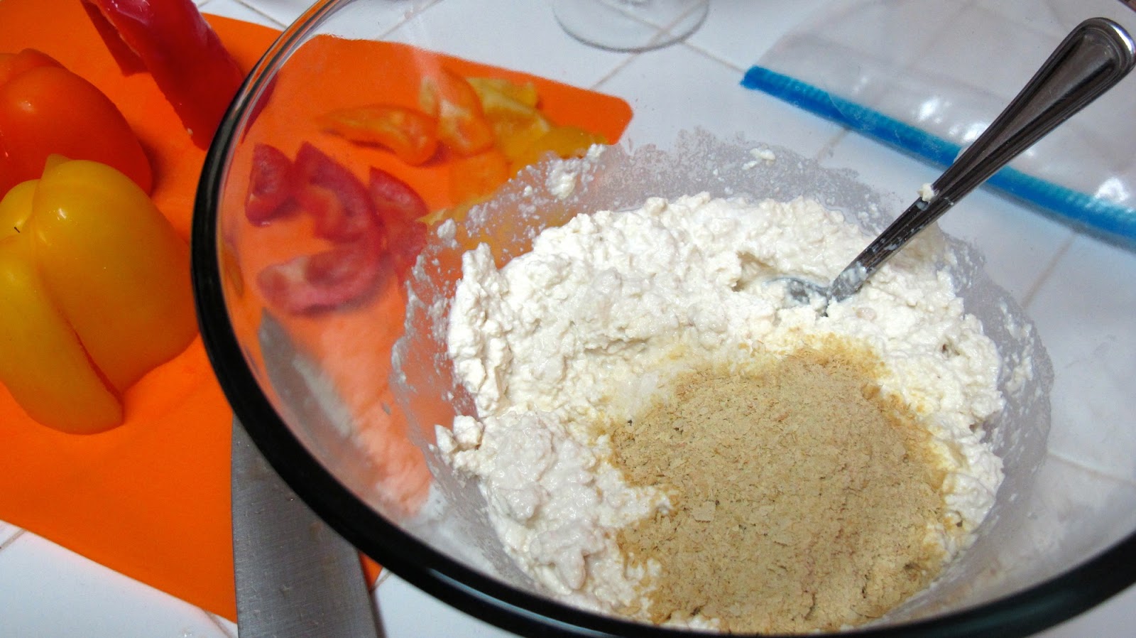 Soak cashews for 5-7 hours (no longer or they will get bitter) in enough water to completely cover. Drain cashews and add to a blender with 1 cup of fresh water. Blend until smooth and creamy. Drain and press tofu and crumble into small pieces into a large bowl. Add Cashew cream and the rest of the ingredients in with the tofu and blend.