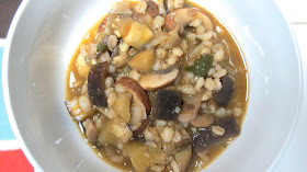 Chop onion and cook in a small amount of vegetable stock in a large pot over low-medium heat. Cube eggplant and thinly slice baby bello mushrooms. Add chopped garlic, eggplant, and baby bellos to pot along with 3 C. vegetable stock, cilantro, vegetable seasoning, and cardamon. Cover and bring to a quick boil, immediately reducing heat to a simmer. Cook until eggplant and mushrooms are tender (about 15-20 minutes). Add in pearled barley. Serve with a splash of soy sauce.