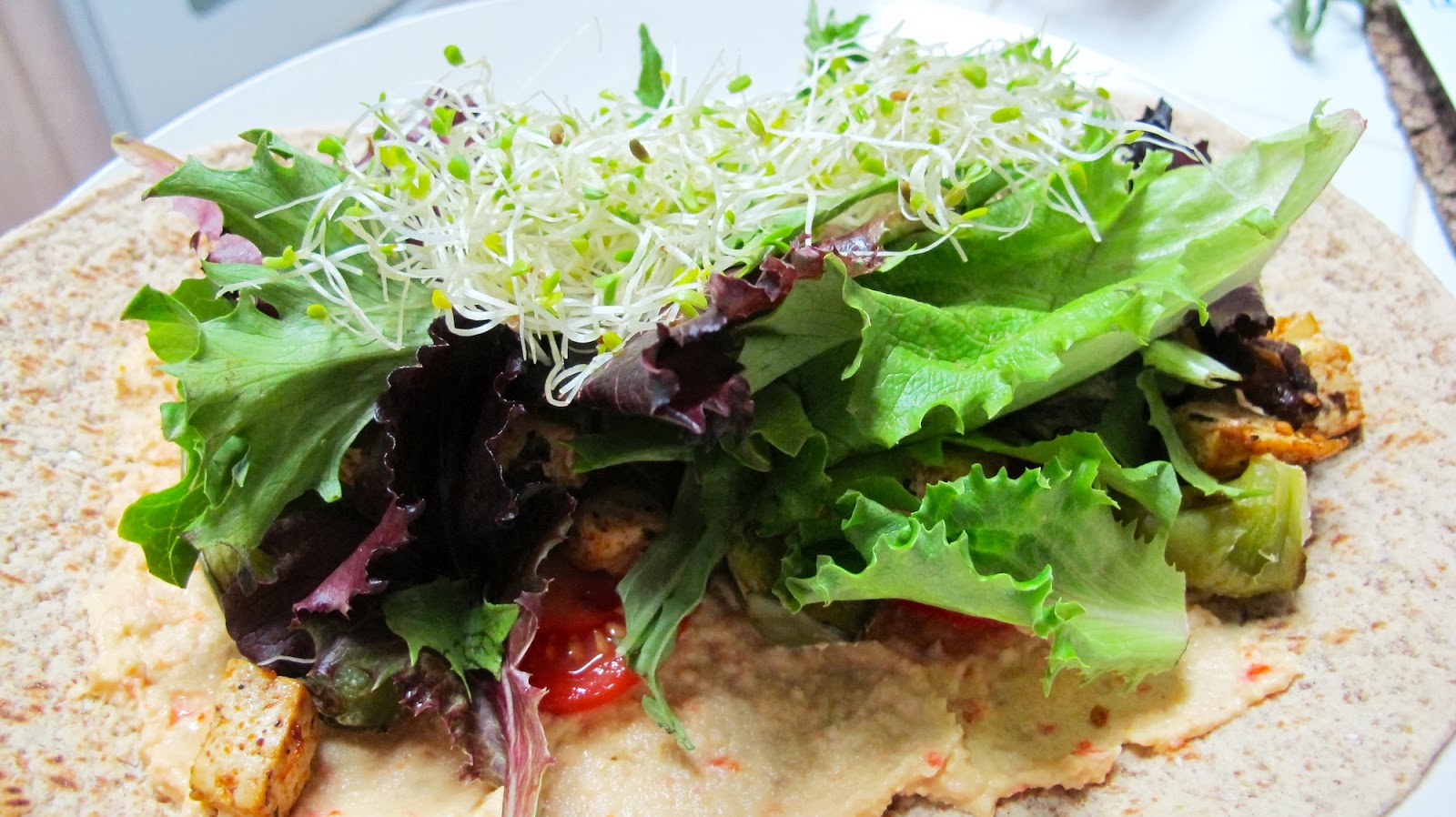 Roasted red pepper hummus w/roasted green pepper and sliced tomatoes, greens, sun-dried tomato tofu, and alfalfa sprout wrap
