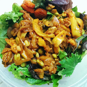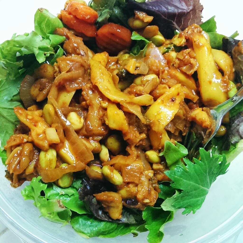 Use a small amount of vegetable stock to sauté red onion and garlic on medium heat until tender. Add the rest of the vegetable stock (or coconut milk) along with red curry paste, ginger, brown sugar, curry powder, Chinese five spice, and cinnamon. Fold in jackfruit, edamame, carrots, broccoli, and cauliflower. Cover and cook on medium-low heat until veggies are tender. Incorporate red pepper flake and cashews and cook covered on low for 5 more minutes before serving. Season with sea salt and freshly ground black pepper to taste.