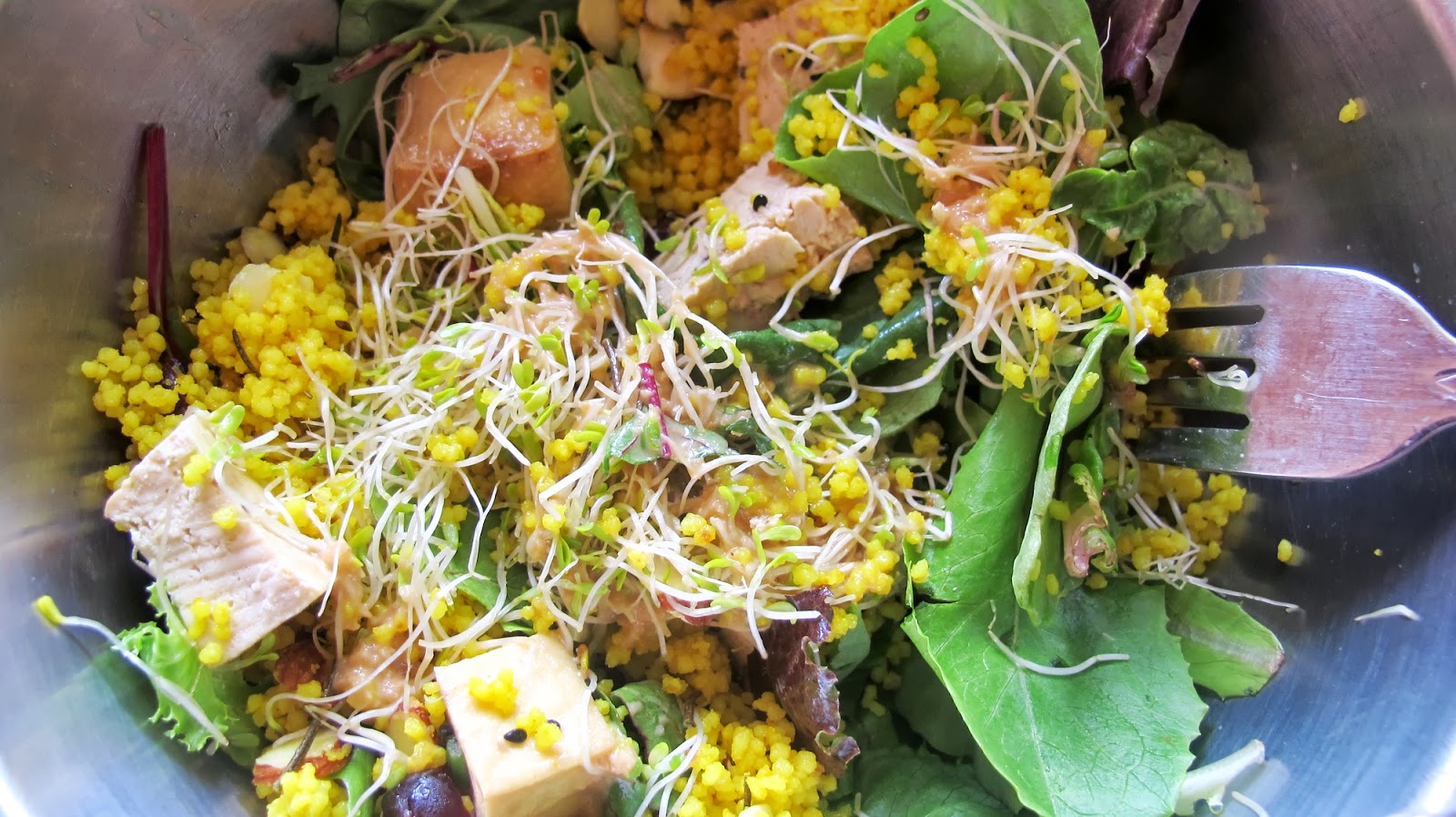 Salad #9Curry and turmeric couscous with chopped sweet mesquite almonds | Salad #10Spring mix, and WF's wild spring mix with cherry tomatoes, broccoli, avocado, raw broccoli and carrot salad, mushrooms, quinoa, and garlicky kale, and oil-free balsamic vinaigrette |