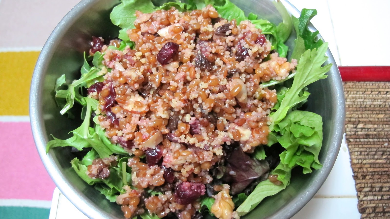Salad #1Whole Food's whole wheat couscous, wheatberries, pablano peppers, green chilies, roasted red peppers, Thompson raisons, dried cranberries, and ginger powder. Served with alfalfa sprouts and a drizzle of honey on a bed of mixed greens. | Salad #2Whole Foods's wheatberries, slivered almonds, walnuts, dried cranberries, Thompson raisons. Served on a bed of mixed greens. |