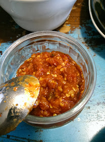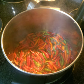 Meanwhile, add the rest of the red Thai chili peppers, along with the remainder of the ingredients to a pot and bring to a simmer over medium heat, before covering and simmering on low. When onions and garlic are ready, add to pot and turn off heat. (You may want to wait until the contents in the pot have cooled some before doing the next step.) Add contents of pot to a food processor and process until smooth. Best stored in a glass jar/container.